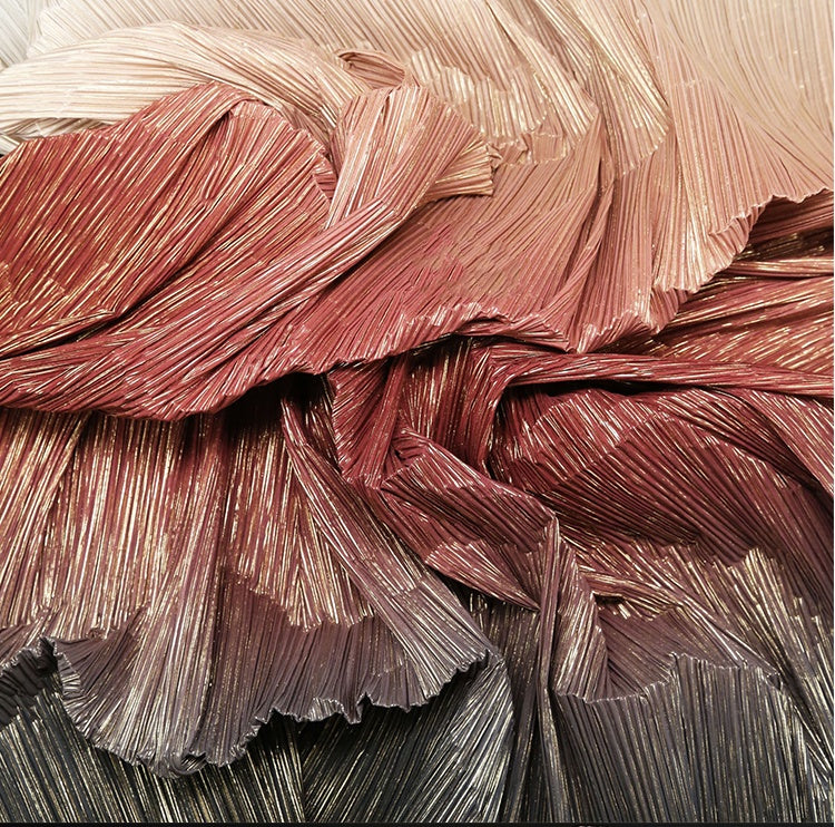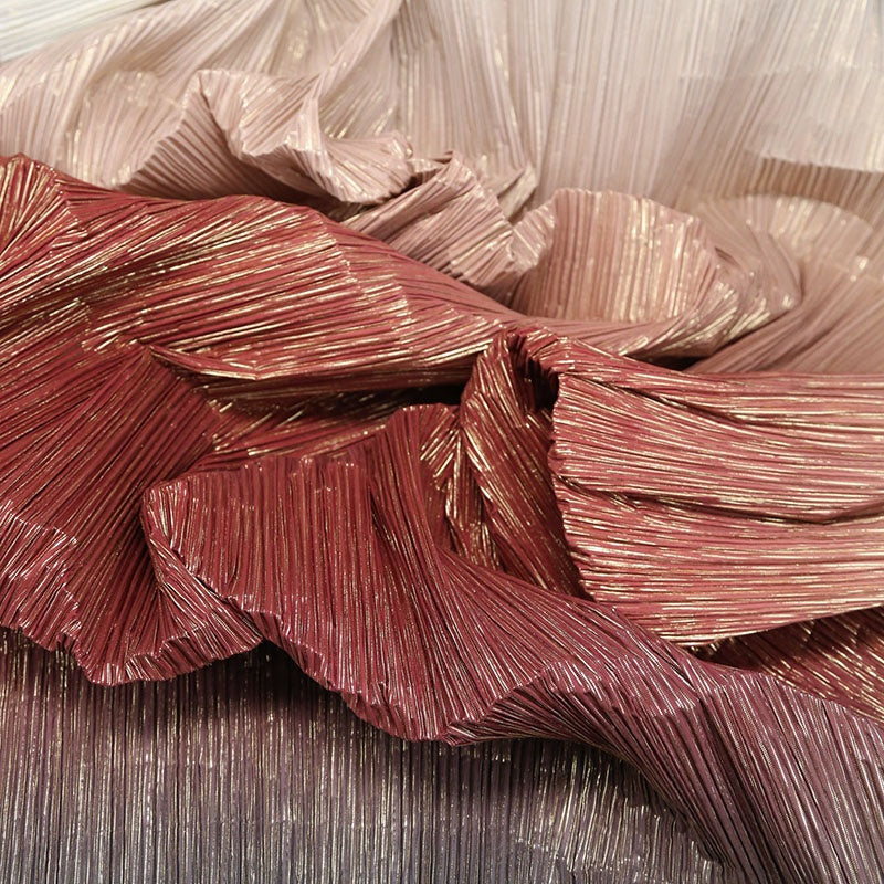 This gradient fabric's red, black, and gold colors add a bold and elegant touch to any wedding decoration. The unique stamped, pleated, and wrinkled texture creates a sophisticated and eye-catching look. Perfect for adding dimension to table runners, chair covers, and other decor.